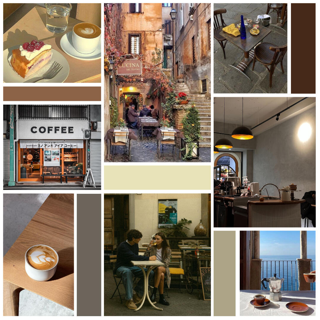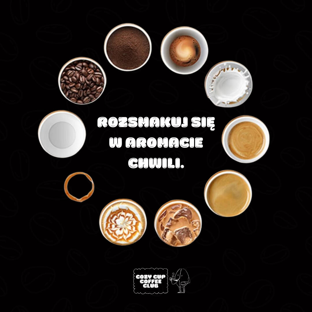 Wyobraź sobie poranek w ulubionej kawiarni – pierwsze promienie słońca wpadają przez okno, para leniwie unosi się nad filiżanką, a w powietrzu wiruje zapach świeżo mielonych ziaren i spienionego mleka. To właśnie ta atmosfera stała się dla nas punktem wyjścia. Ciepłe, ziemiste brązy, beż latte i głęboka czerń espresso w naturalny sposób wplotły się w paletę barw, tworząc klimat, który od razu przywodzi na myśl dobrą kawę. Inspirowaliśmy się nie tylko kolorami, ale też fakturami – matową ceramiką kubków, gładkością mlecznej pianki, subtelnym światłem rozpraszającym się na drewnianych blatach. Typografia przywołuje ręcznie pisane menu na tablicy przy barze, a delikatnie rozmyte tła nawiązują do chwil, gdy czas zwalnia przy pierwszym łyku kawy.